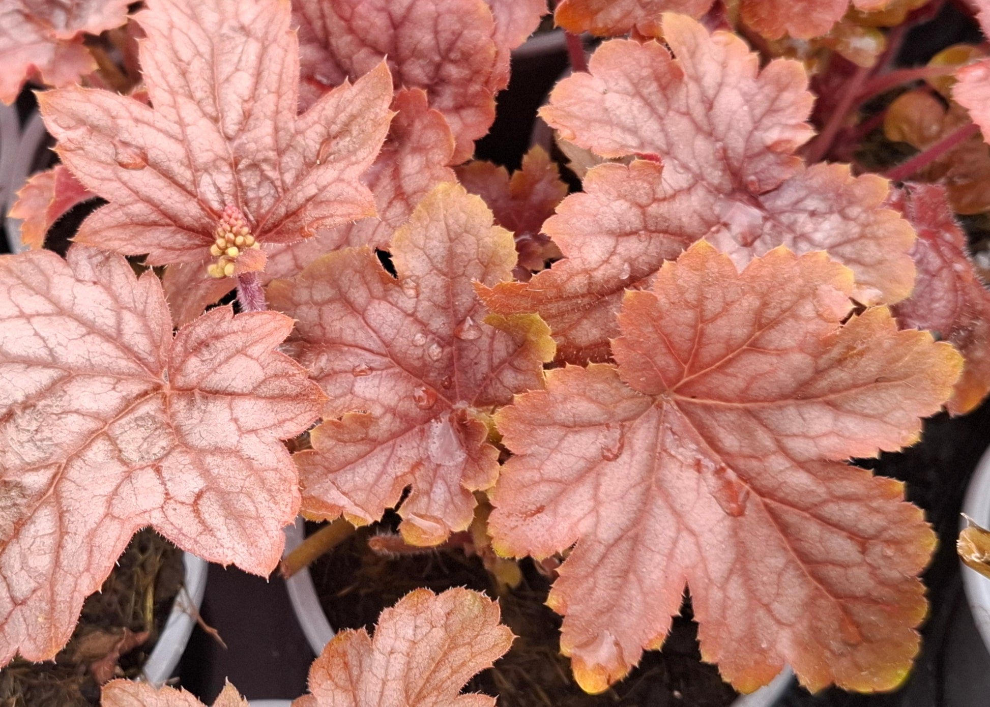 - Perhaps the most attractive feature is the lobed, darkly veined, peach to rich red foliage that forms a compact mound and contrasts beautiful with the cream flowers.
